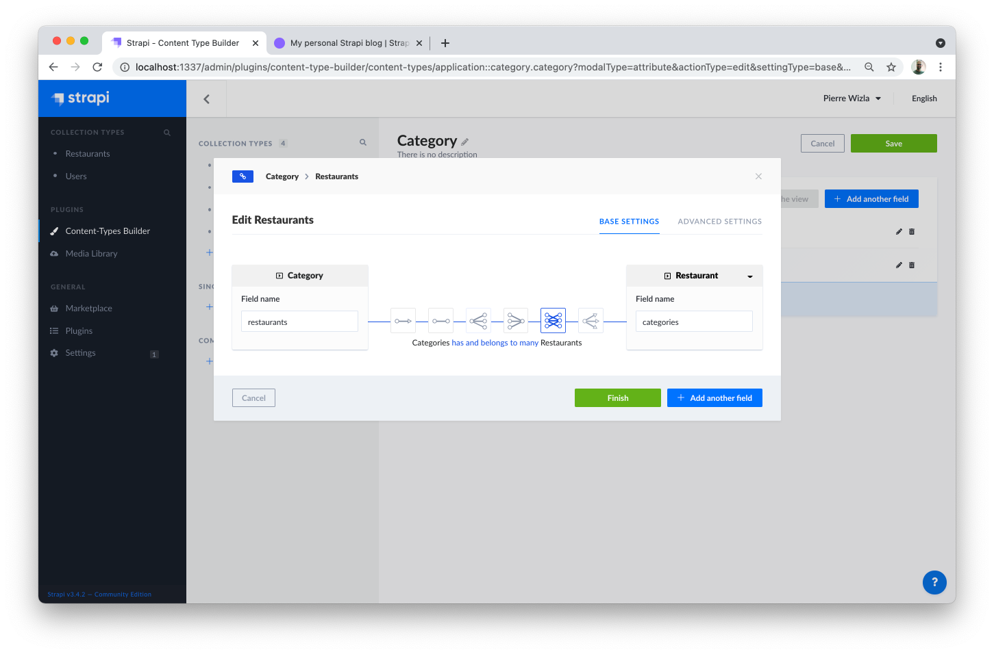 Now that we have created a basic data structure with 2 collection types, "Restaurant" and "Category", let's use them to actually add content by creating new entries.