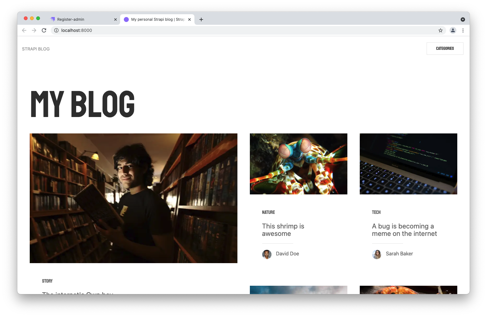 - The second tab (http://localhost:8000 (opens new window)) is for the front end of your application, and you can already see the Gatsby blog in action.